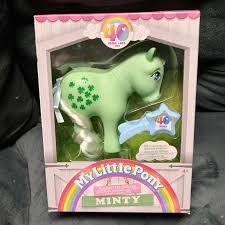 this is a MAIL ORDER MINTY. ok beau what is that. WELL. at the beginning of year 2 (aka 1983-1984) hasbro created a mail order program known as the horsehoe points program!! consumers would clip the horseshoe points from the packages of their storebought ponies and mail them, along with a check or money order, to hasbro in exchange for exclusive ponies and merchandise. the us mail insert order story reads: "minty closes her eyes and makes a special wish with a four-leaf clover from the meadow." as we know (or maybe you DON'T know grr) g3 minty is known for being pretty clumsy and her cutie mark is different too. this is an interesting contrast from the original minty, who is known for the four leaf clover and being pretty lucky!! also this minty is mega expensive and rare ESPECIALLY SEALED it's usually about £120-£200....ggulp